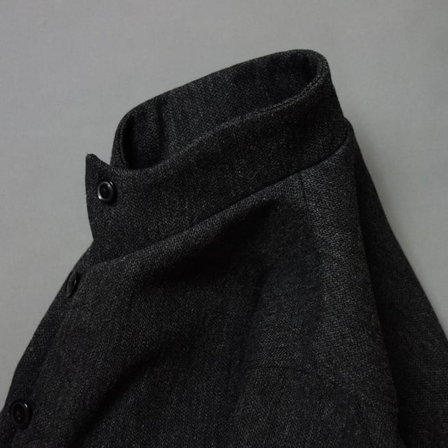 機能性を備えた左右非対称の襟は鋭く立ち上がりハイネックとなります。