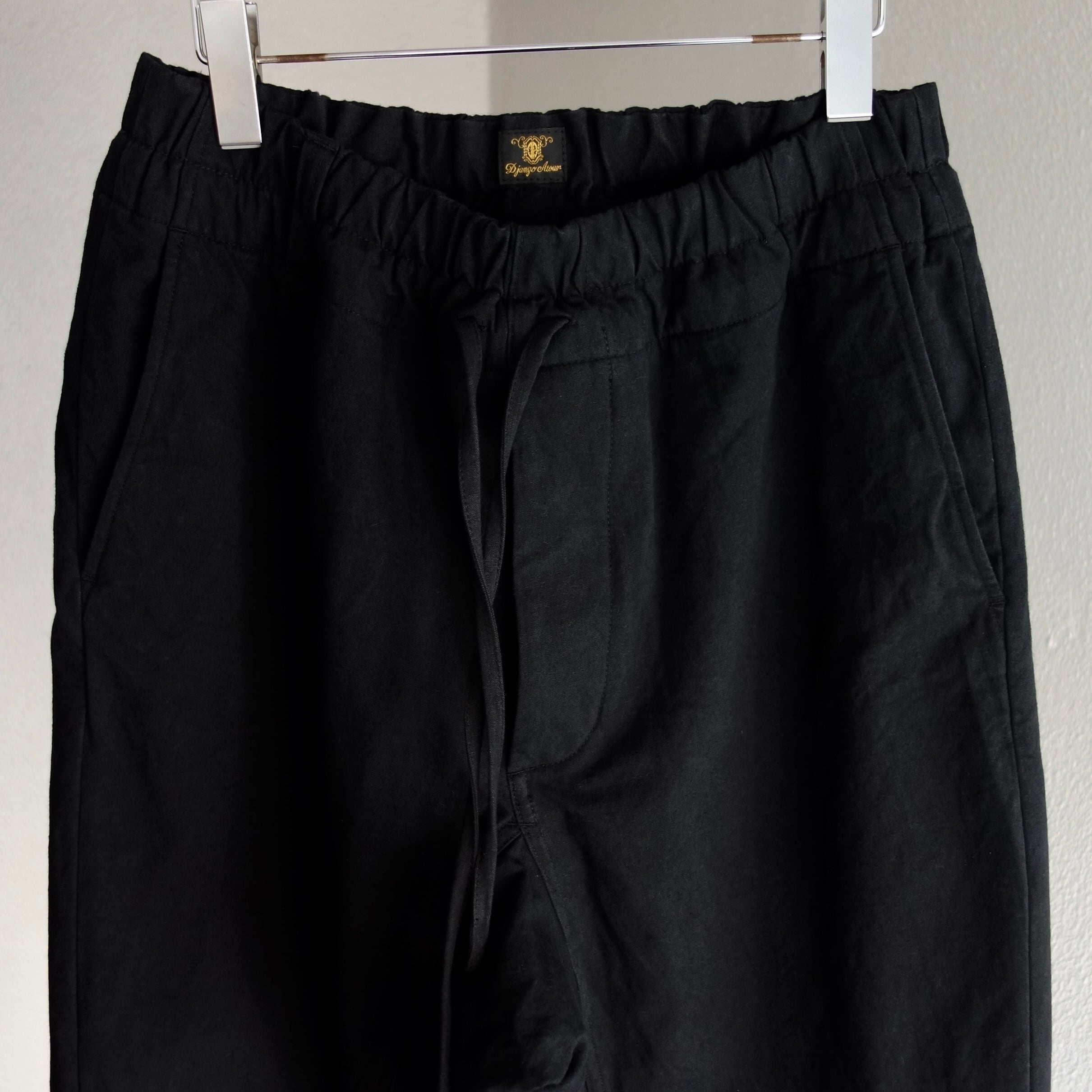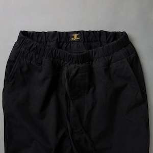 ウエストはゴム仕様でリラックスな穿き心地。また共生地の紐を通しています。