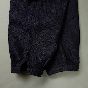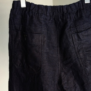 今回はやや厚手でしっかりとしたインディゴ染めの刺し子調のデニムを使って製作。